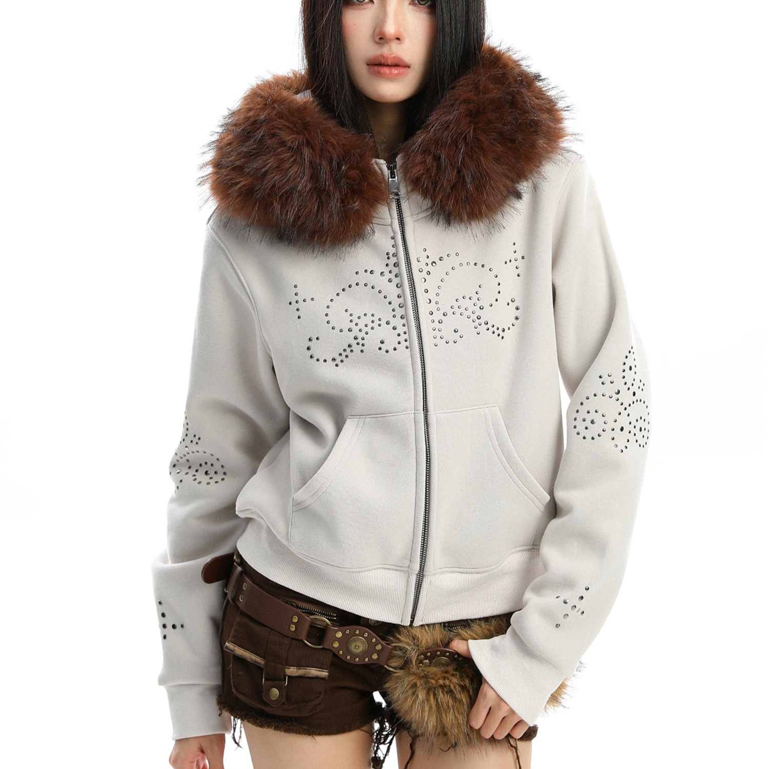 All-matching Solid Color Retro Furry Stitching Velvet Zipper Casual Coat